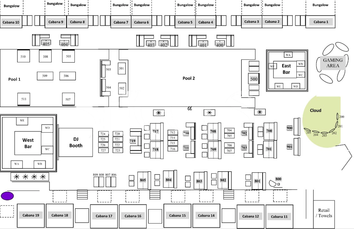 Daybed, Cabana and Bungalow Pricing varies depending on the demand and the event for that day. Get a quote here.